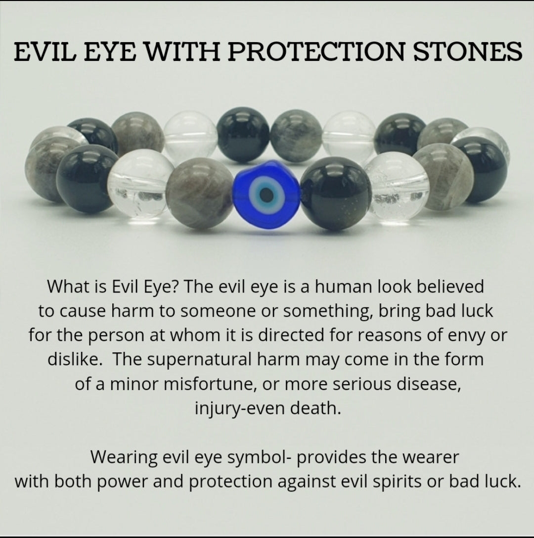 Evil Eye: When a person wears or carries an evil eye with them, it guards against misfortune happening in one's life. The evil eye brings good luck and protects you from any ill-will that could otherwise have a negative effect on your well-being or your life in general.
